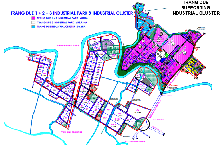 The Trang Due Supporting Industrial Cluster is located about 1.5 km from National Highway No. 10 and is adjacent to the Trang Due 1 & 2 Industrial Parks. This industrial cluster holds a strategic position, not only for the surrounding supply chain of the existing Trang Due Industrial Park but also for businesses in the economic triangle of Hanoi, Hai Phong, and Quang Ninh.