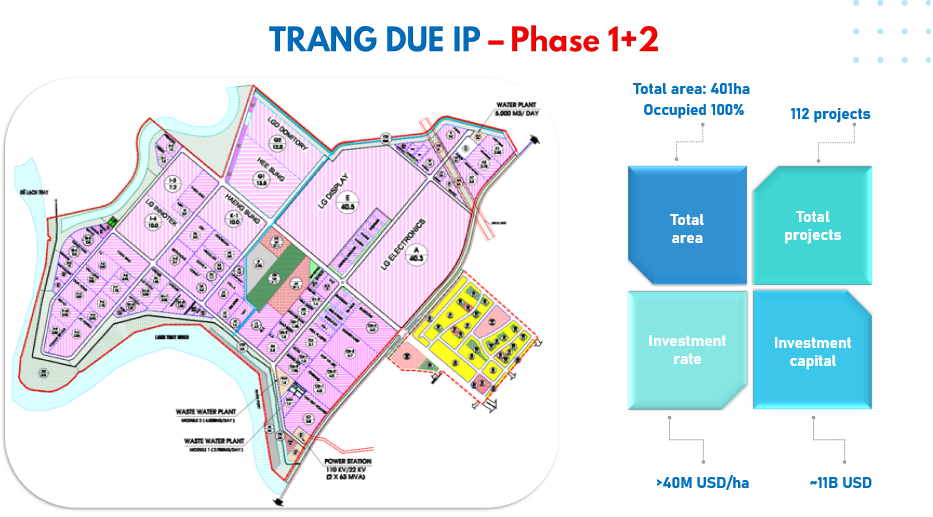 Trang Due Industrial Park officially commenced operation in 2007, developed and invested in by Sai Gon – Hai Phong Industrial Park Corporation (SHP) as the infrastructure developer. Over nearly 15 years of establishment and development, Trang Due Industrial Park has become one of the largest and fastest-growing industrial parks in Hai Phong City. With its outstanding performance in investment attraction over nearly 20 years since its establishment, the Trang Due Industrial Park project was honored with the Outstanding Industrial Park Award 2022. At present, Trang Due Industrial Park phases I and II, with a total area of 401 hectares, have achieved 100% occupancy of their commercial land, and SHP is continuing to develop the Trang Due Industrial Park phase III project. The average annual export turnover of Trang Due Industrial Park is estimated at USD 12–14 billion, contributing thousands of billions of VND to the state budget each year, and helping Hai Phong City become one of the leading localities in Vietnam in attracting FDI in recent years.