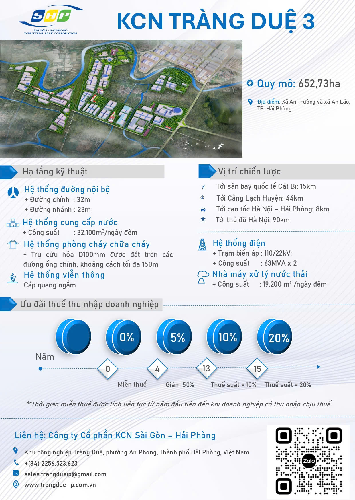 Khu công nghiệp Tràng Duệ 3tổng diện tích 652,73ha đã nhận được Quyết định chấp thuận chủ trương đầu tư số 86/QĐ-TTg vào ngày 14/01/2025 do Thủ tướng Chính phủ phê duyệtCông ty cổ phần Khu công nghiệp Sài Gòn – Hải Phòngđơn vị đầu tư kinh doanh kết cấu hạ tầng kỹ thuật của Khu công nghiệp Tràng Duệ 3Thời hạn hoạt động của Khu công nghiệp Tràng Duệ 3 kéo dài đến năm 2075. Một trong những điểm nổi bật của Khu công nghiệp này là vị trí giao thông thuận tiện. Nằm tại xã An Trường và xã An Lão (trước đây là các xã Trường Thọ, Trường Thành, An Tiến, Bát Trang, huyện An Lão, thành phố Hải Phòng), liền kề quốc lộ 10 và đường cao tốc Hà Nội – Hải Phòng khoảng 8km, điều này tạo điều kiện thuận lợi cho việc di chuyển hàng hóa và tiếp cận các tuyến giao thông chính.