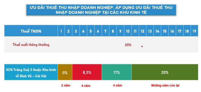 Với lợi thế nằm trong Khu kinh tế Đình Vũ - Cát Hải, các doanh nghiệp trong Khu công nghiệp Tràng Duệ 3 sẽ được hưởng các chính sách ưu đãi về thuế hấp dẫn, đặc biệt là về mảng thuế thu nhập doanh nghiệp.